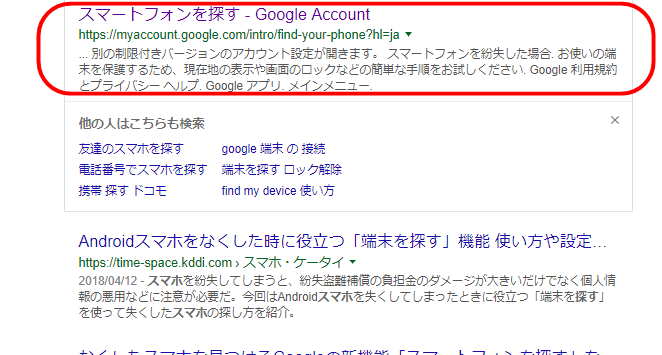 ①パソコンや別のスマホを使って「スマホを探す」でネット検索し、下の画像の赤丸で記したものにアクセスする