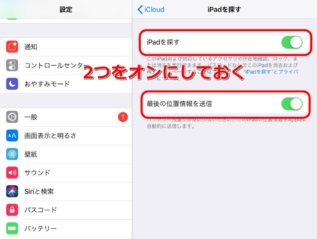 ②「iPhone を探す」と「最後の位置情報を送信」をスライドさせてオンにする