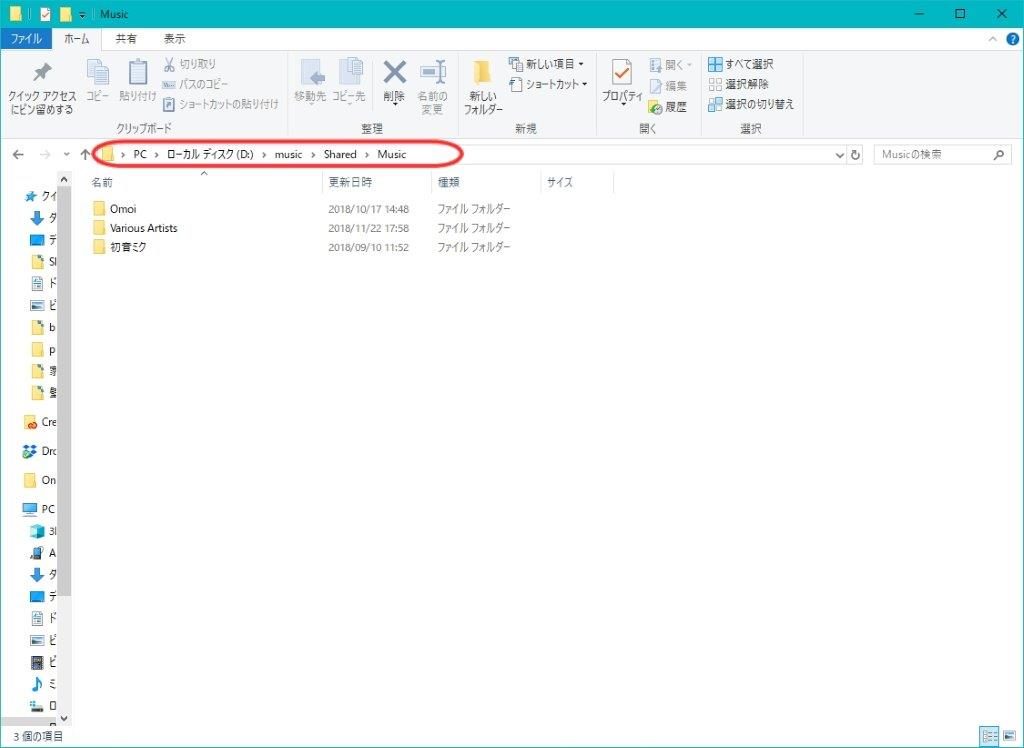 「D:\music\Shared\Music」という場所に音楽が格納されていますので、