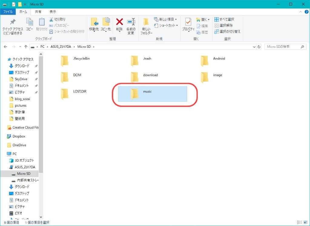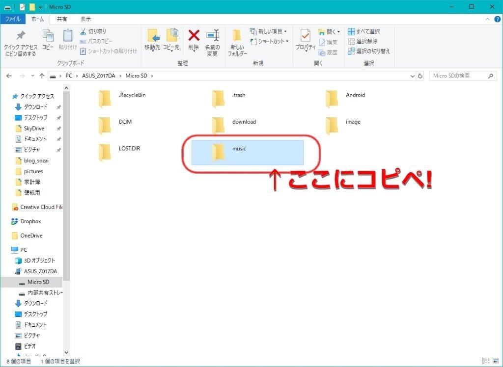 あとはフォルダ内の音楽をスマホ側に作った「music」フォルダにコピペすれば、